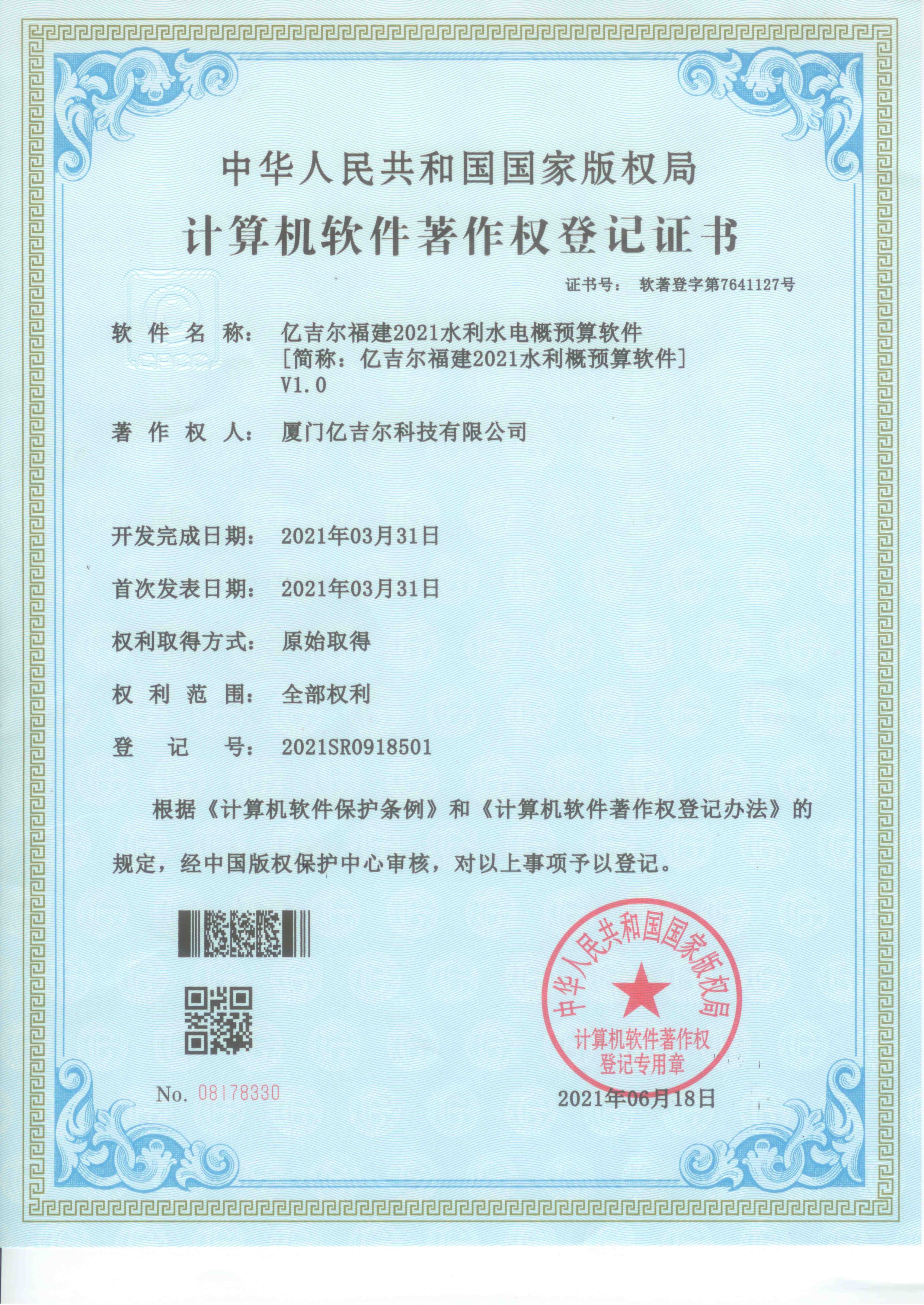 億吉爾福建2021水利水電概預(yù)算軟件著作權(quán)證書 發(fā)布日期:2023年11月22日 瀏覽次數(shù):2631 關(guān)鍵字: 公司 1/1億吉爾福建2021水利水電概預(yù)算軟件著作權(quán)證書