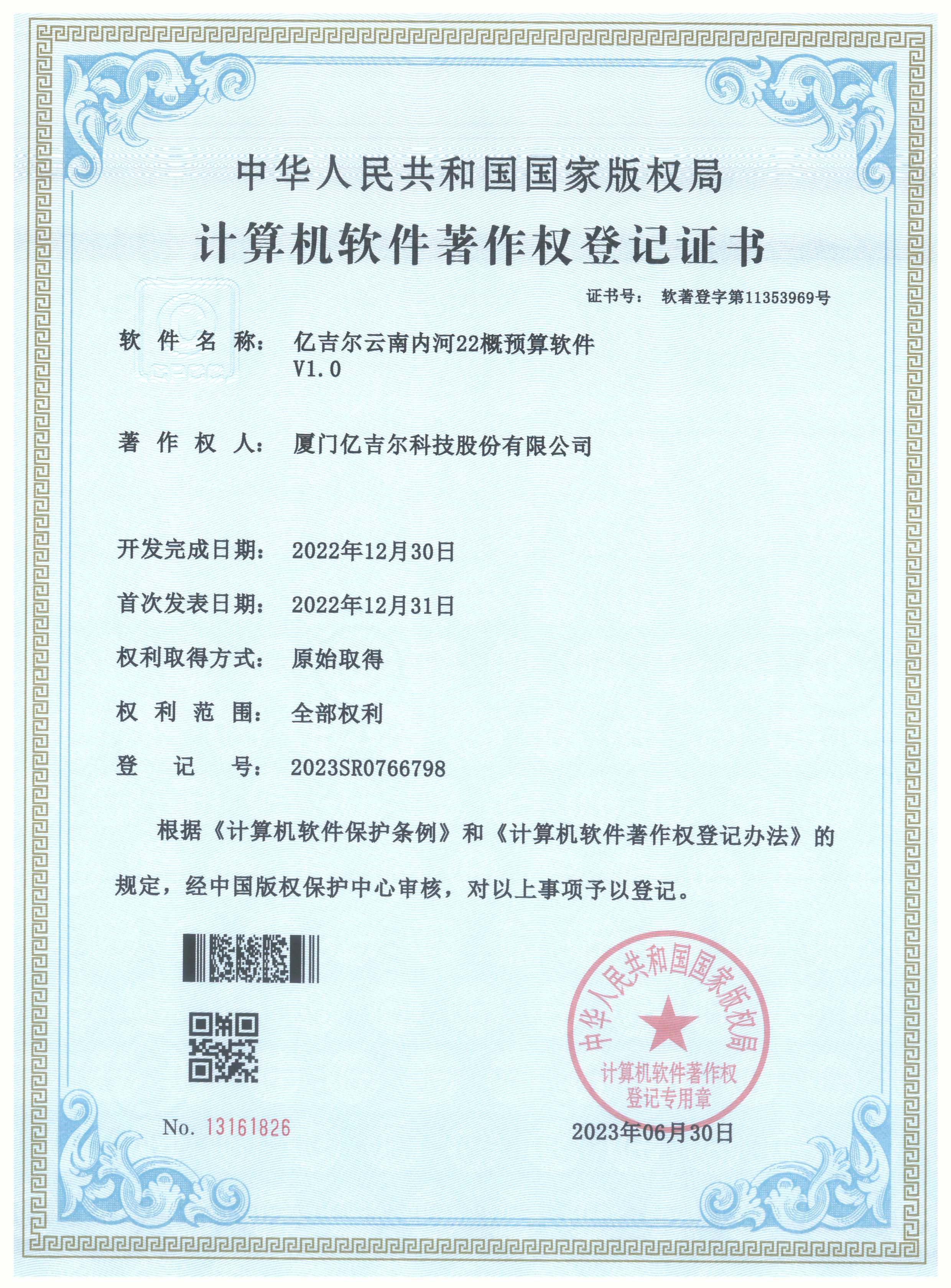 億吉爾云南內(nèi)河22概預(yù)算軟件登記證書 發(fā)布日期:2023年11月22日 瀏覽次數(shù):2637 關(guān)鍵字: 公司 1/1億吉爾云南內(nèi)河22概預(yù)算軟件登記證書(2023R11L0546651)