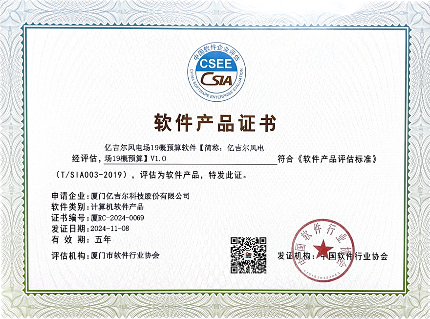 億吉爾風電場19軟件產品證書